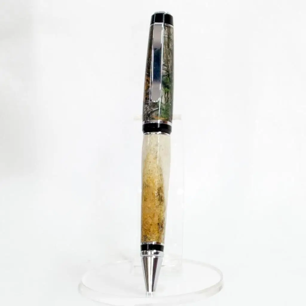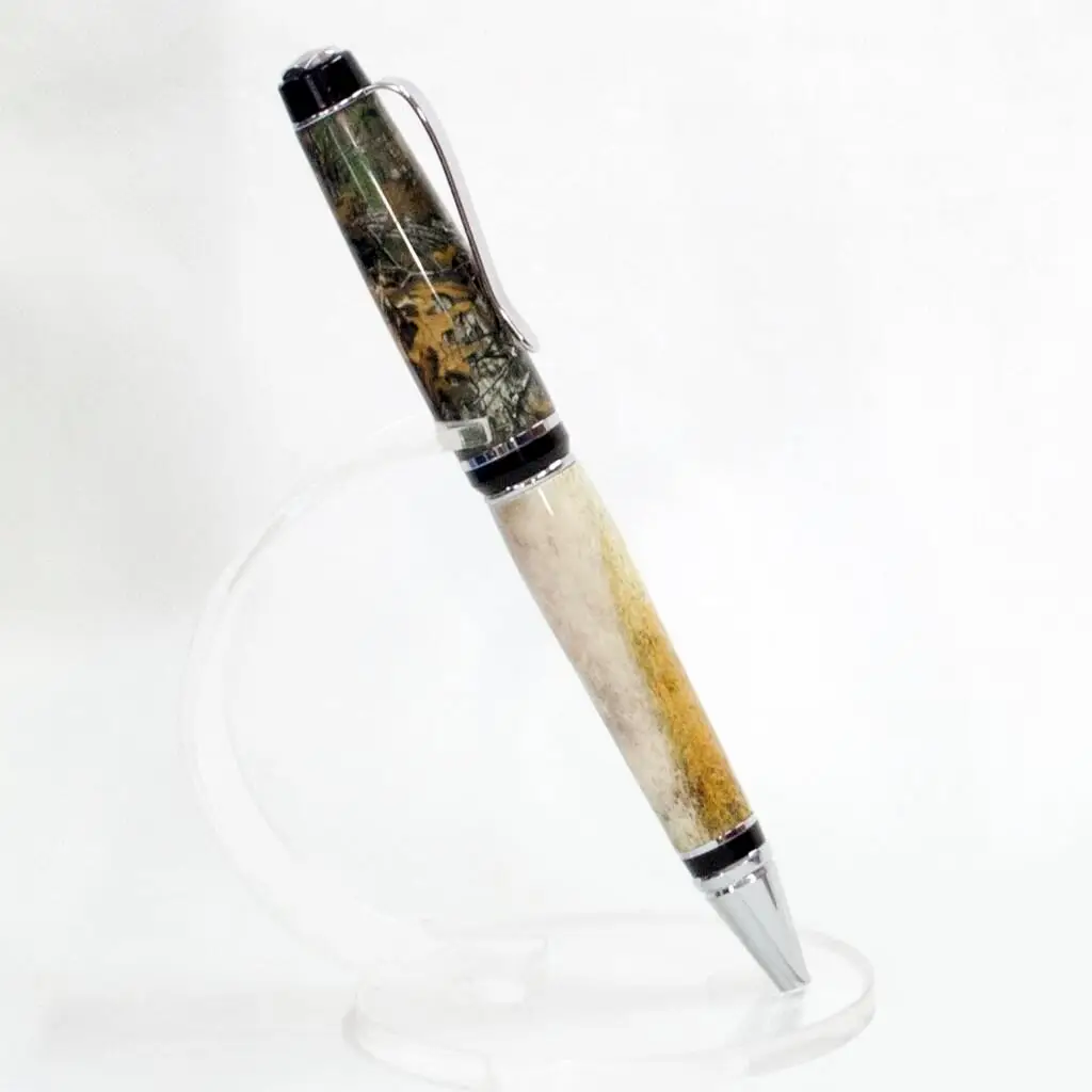 This twist ballpoint pen is cast with Realtree® Camo on the top and a piece of real deer antler on the bottom. This pen has a nice balance and is right at home in the great outdoors or a high-rise office. Since each pen is individually made upon ordering, they are all unique, but they will be similar to the one in the photographs. The pen shown is made with Realtree Xtra Green®, but other patterns are available.